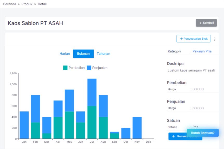 Nikmati tampilan ringkasan pembelian dan penjualan untuk setiap produk dalam bentuk visual yang informatif dan menarik. Data transaksi disajikan secara ringkas melalui grafik dan elemen visual lainnya, sehingga memudahkan kamu melihat performa produk, memantau tren penjualan, serta mengidentifikasi kebutuhan restock dengan lebih cepat dan efisien.